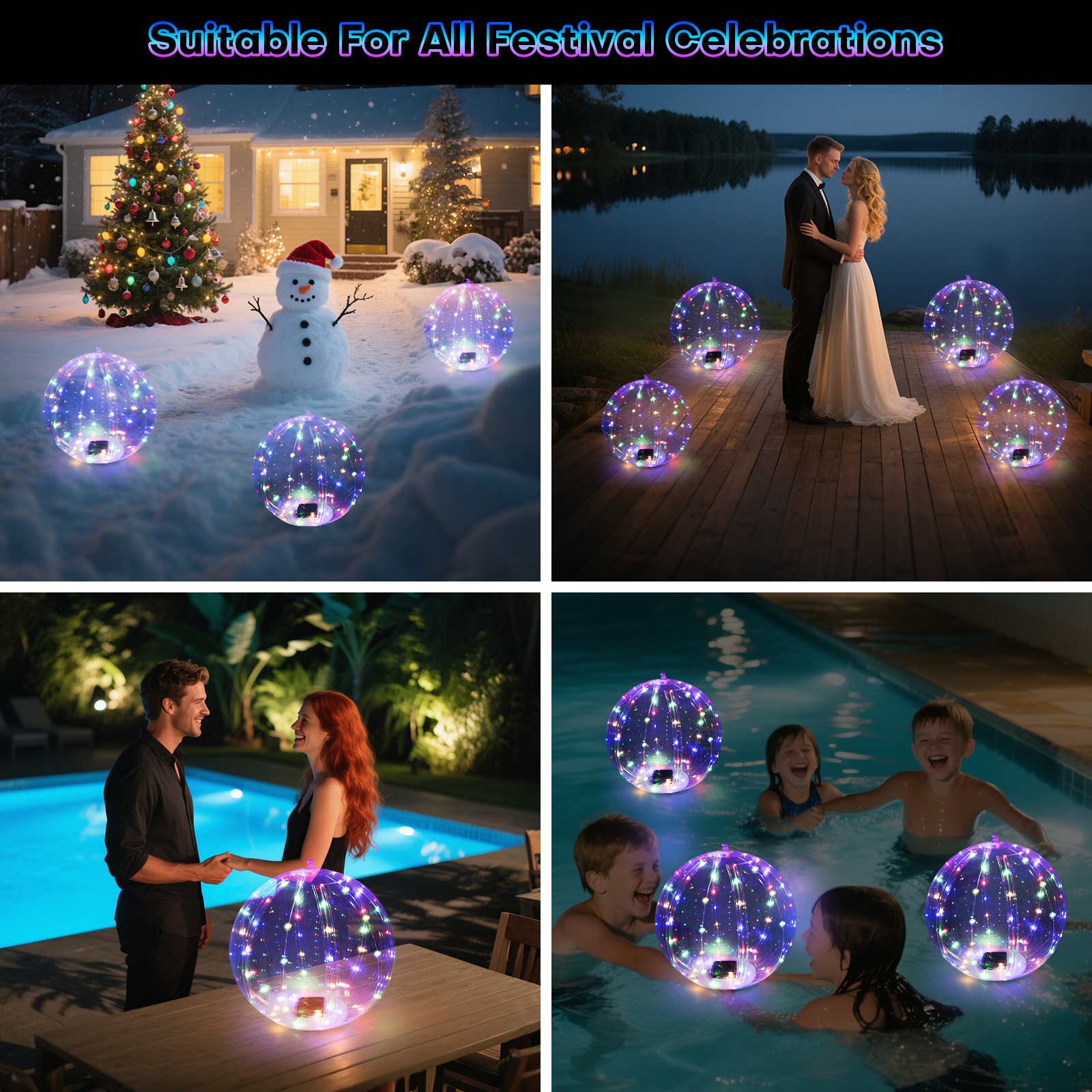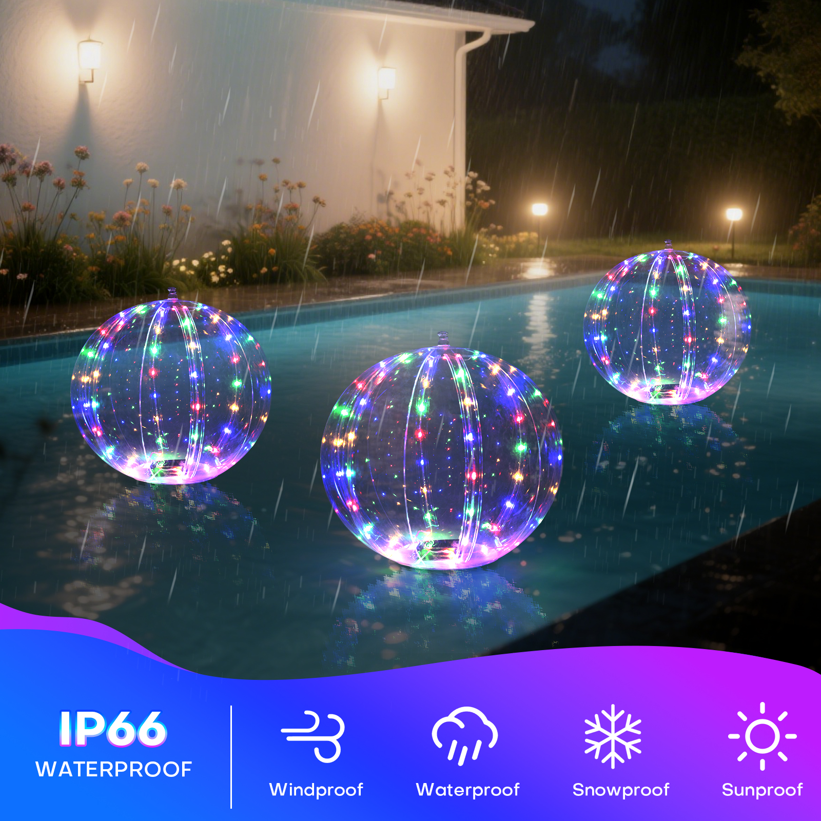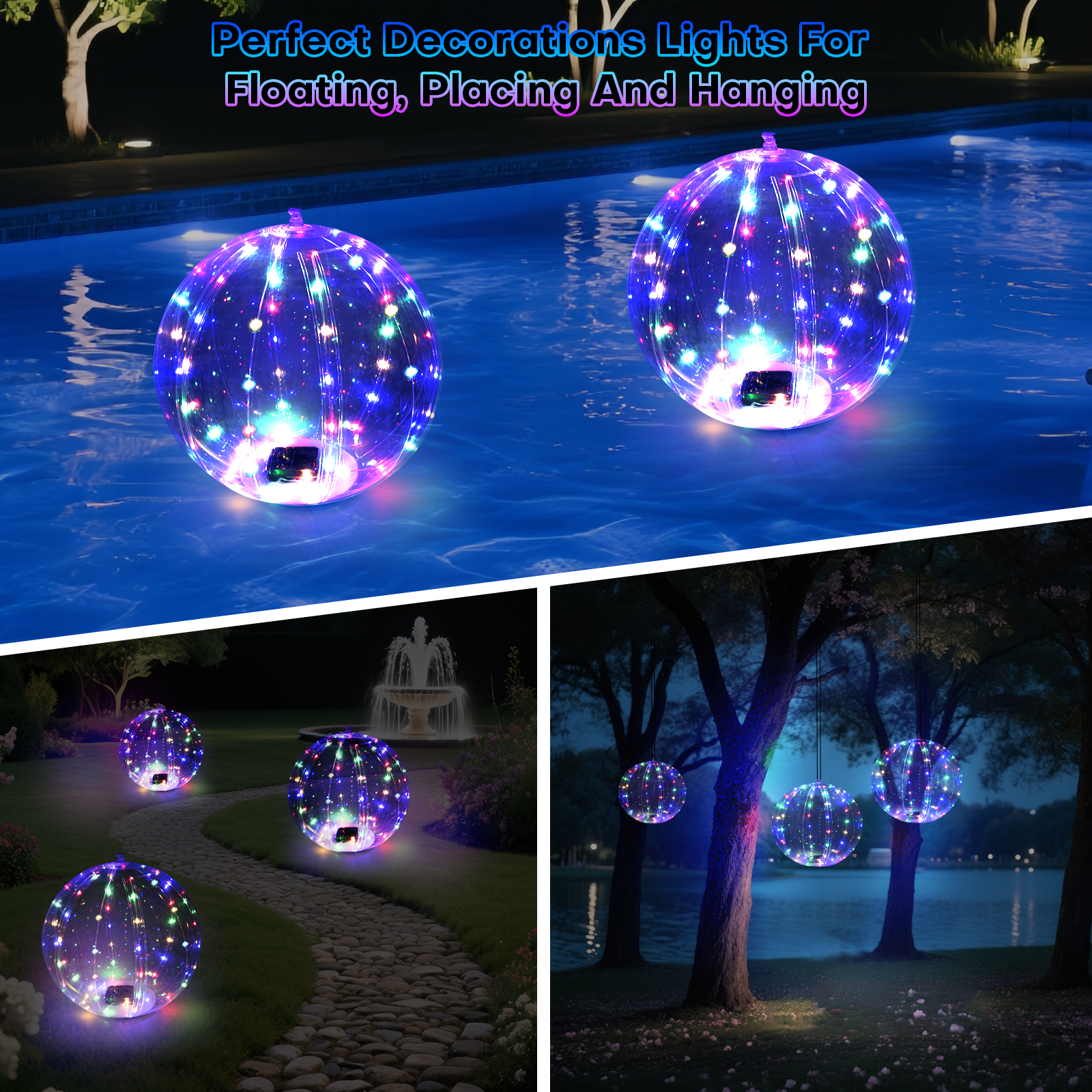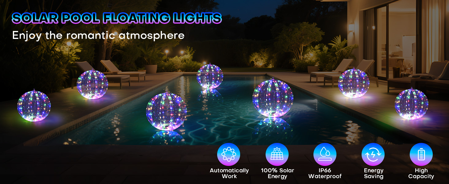 - IP66 Waterproof And Floatable — Our floating solar lights adopt IP66 waterproof technology, fully waterproof and dust-protected, The bottoms of the glow balls for pool are flat, so they can float in a pool or hanging anywhere else. The 14 inch pool lights for above ground pools are inflatable that make the pool light floating on water, the floating pool light create you a warm and romantic atmosphere in your pool