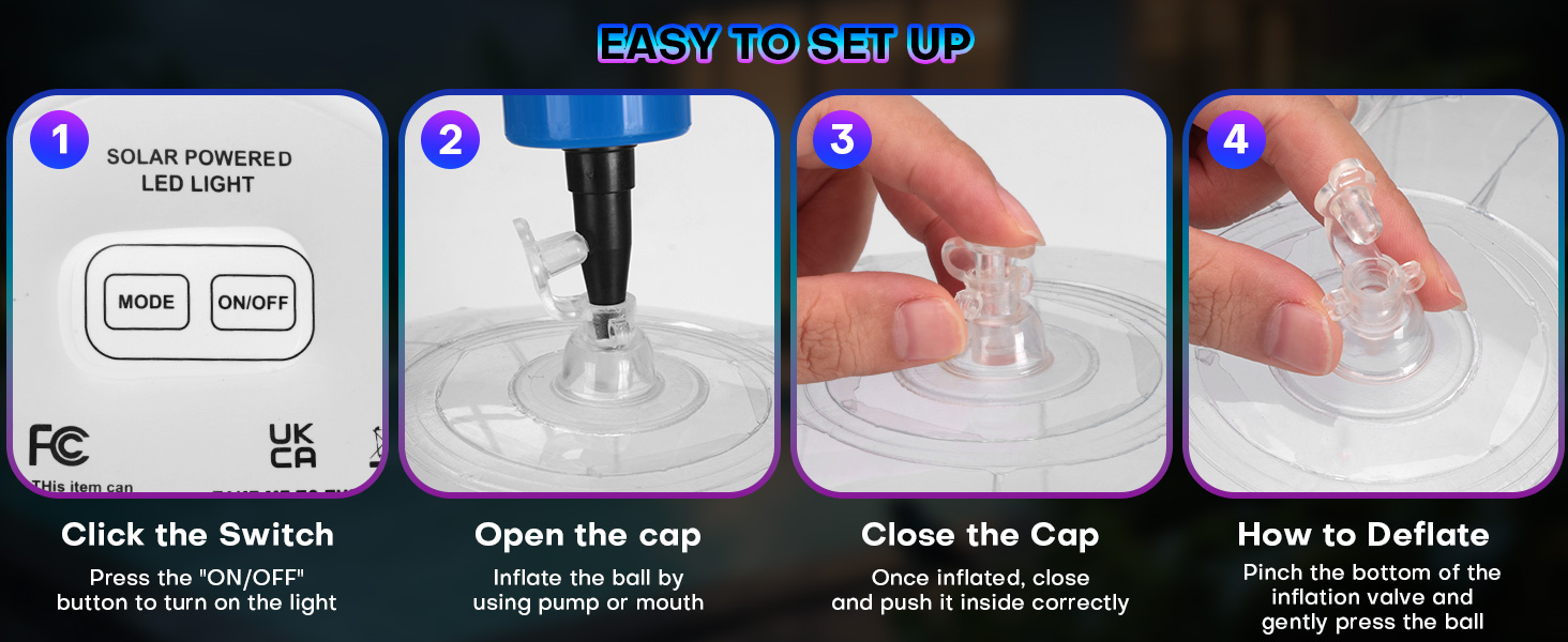 - Easy To Use — The solar balls lights for outside is very easy to use, When you receive the solar pool light product, you should turn it on before inflate. How to confirm it is turned on or off? You can cover it to ensure the solar pannel is not illuminated by the surrounding light, press the bottom switch ON/OFF, the fairy lights will twinkle. 8 lighting modes can be choosed. Then you can inflate the pool light balls by the manual air pump, It can be completed in just a few minutes
