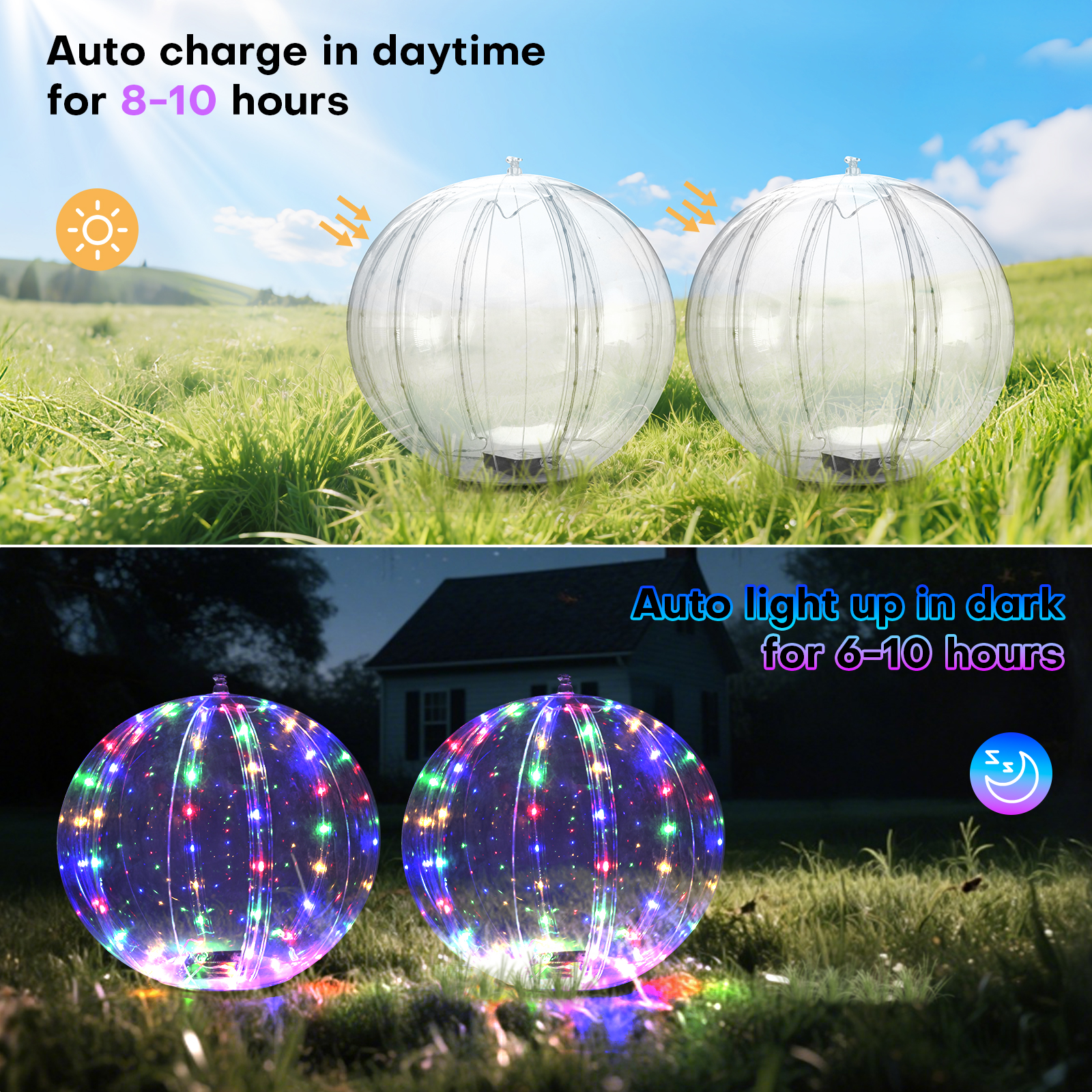- Automatic Charging During The Day And Automatic Lighting At Night — This solar lights for pool need not batteries. The inground pool lights are photosensitive and require charging in the sun during the day, and automatically discharge and light up when the light becomes dim at night. Please switch them in the ON positiont before first use. The solar light balls convert energy from sunlight, The pool lighting products can light up to 8 to 10 hours after fully charge on summer sunlight