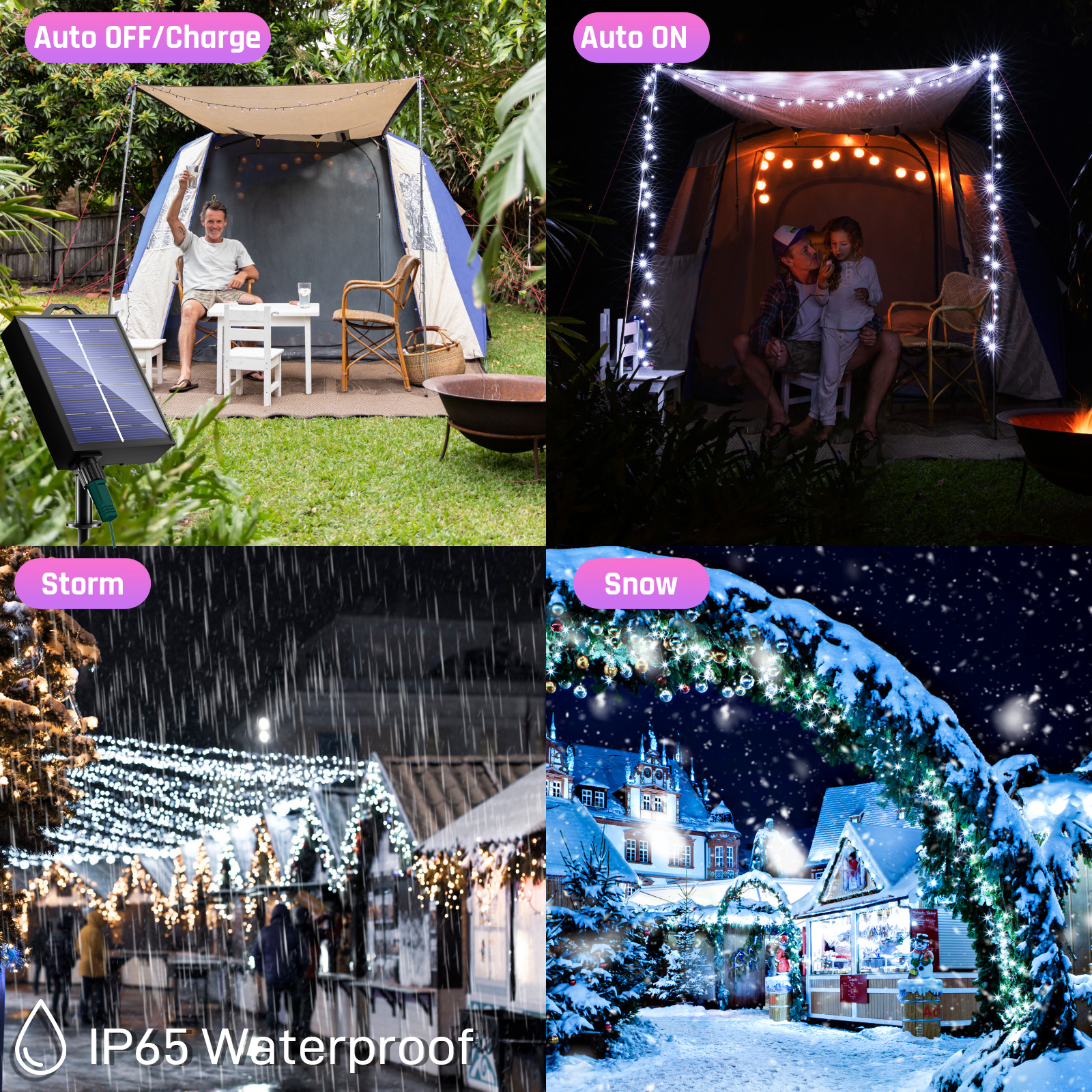 - Waterproof & Memory Function: The christmas solar lights for outdoor can withstand all kind of weather(IP65), including heavy rain and snow. Build in Memory chip save your last modes setting and no need to reset mode every time