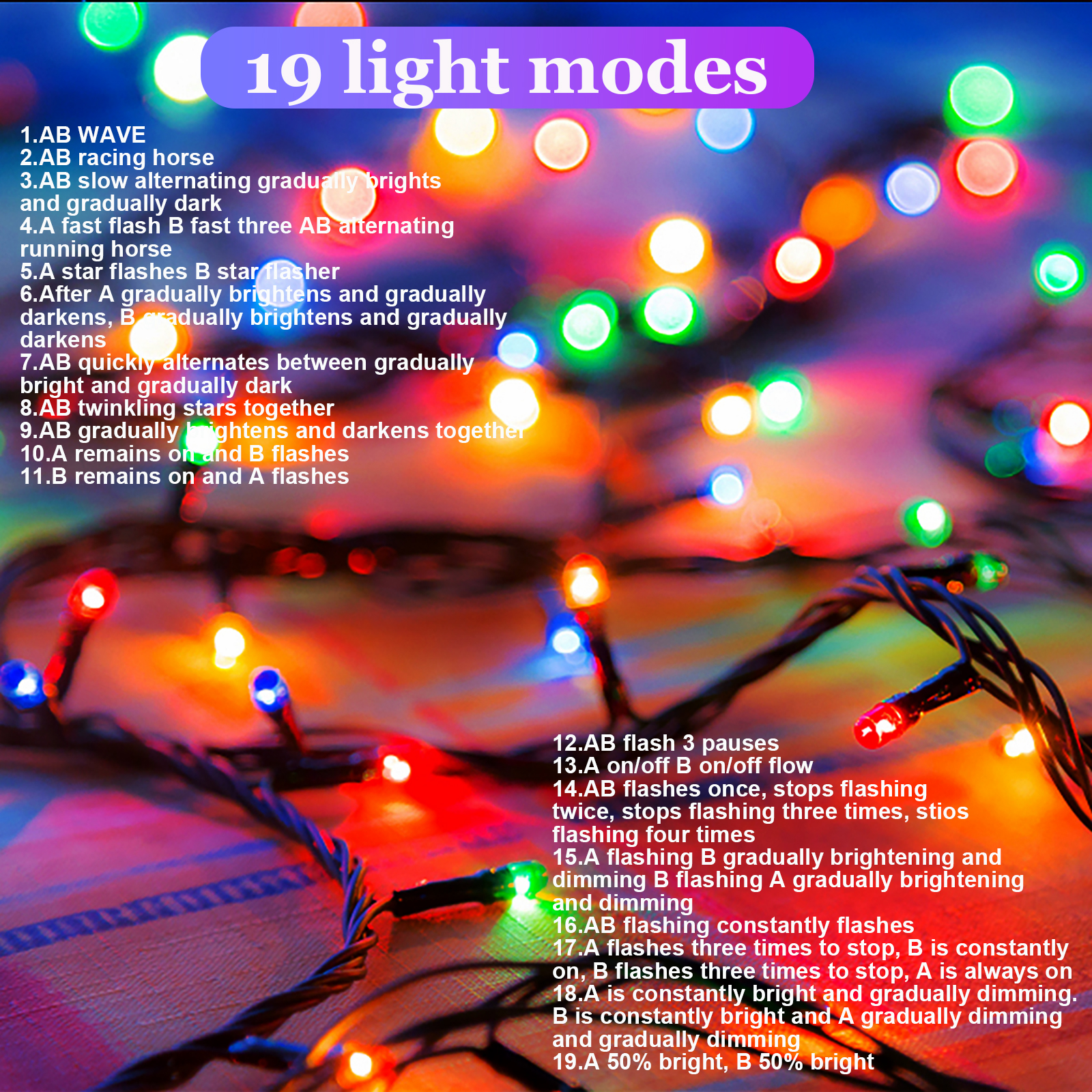- 19 Lighting Modes and Adjustable Brightness: The twinkling solar powered string lights for outside offer 19 lighting modes (Combination, In Waves, Sequential, Slo-Glo, Chasing/Flash, Slow Fade, Twinkle/Flash, Steady On,Etc.), and the brightness is adjustable by press the mode key for 3 seconds, sufficient to built impressive, romantic, joyful, warm atmosphere for you